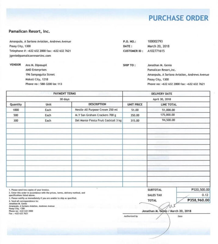 Dưới đây là các nội dung cơ bản cần có trong một Purchase Order: